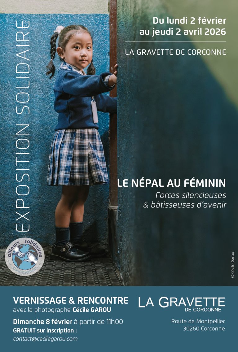 Nous avons le plaisir de vous annoncer la nouvelle exposition solidaire de photographies de notre amie Cécile Garou, photographe professionnelle de grand talent, qui nous a accompagnés lors d’un voyage au Népal avec AiIleurs Solidaires. Cette exposition nommée « le Népal au féminin » se déroulera du 02 février au 2 avril à La gravette de Corconne route de Montpellier 30260 Corconne. Le Vernissage aura lieu le 8 février à partir de 11h. Un grand merci, Chère Cécile, pour faire connaître notre association humanitaire et aimer le Népal grâce à ton talent.