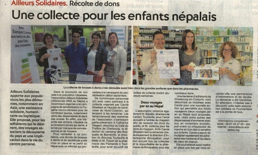 Un grand MERCI à tous pour votre forte mobilisation dans la Manche et notamment le Nord Cotentin, cet été, pour alimenter la collecte de brosses à dents et dentifrices destinée à l’équipe médicale d’Ailleurs Solidaires qui part au Népal en septembre dans le but de sensibiliser les enfants et adolescents des écoles et dispensaires à l’hygiène buccale. Voir article ci-dessous de la Presse de la Manche.